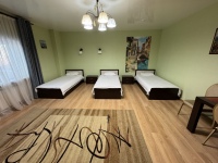 Предложение для самых требовательных клиентов. Вас ждет просторная спальная комната с тремя односпальными кроватями, застеленных белоснежным постельным бельем. Номер оборудован мягкой мебелью, обеденной группой, кондиционером, кулером, TV, выходом в интернет (Wi-Fi), внутренней связью с администратором. Ванная комната оснащена гидромассажной ванной. Для Вашего удобства одноразовые наборы средств личной гигиены, фен.