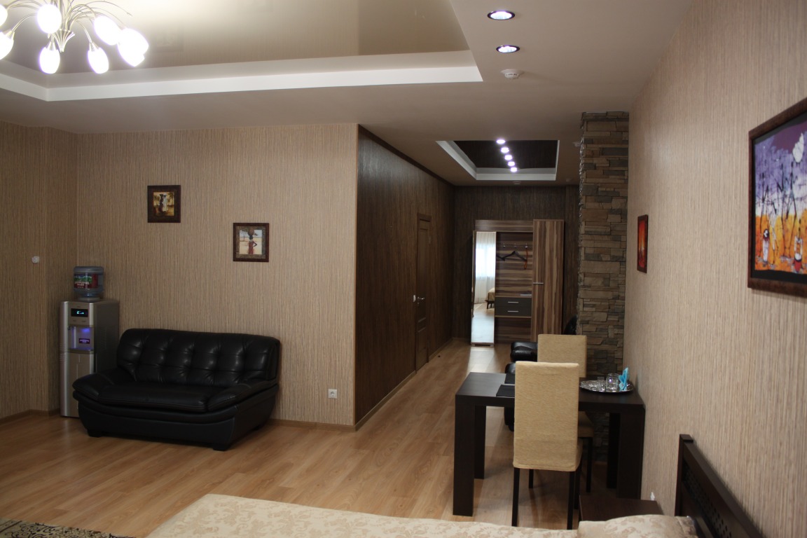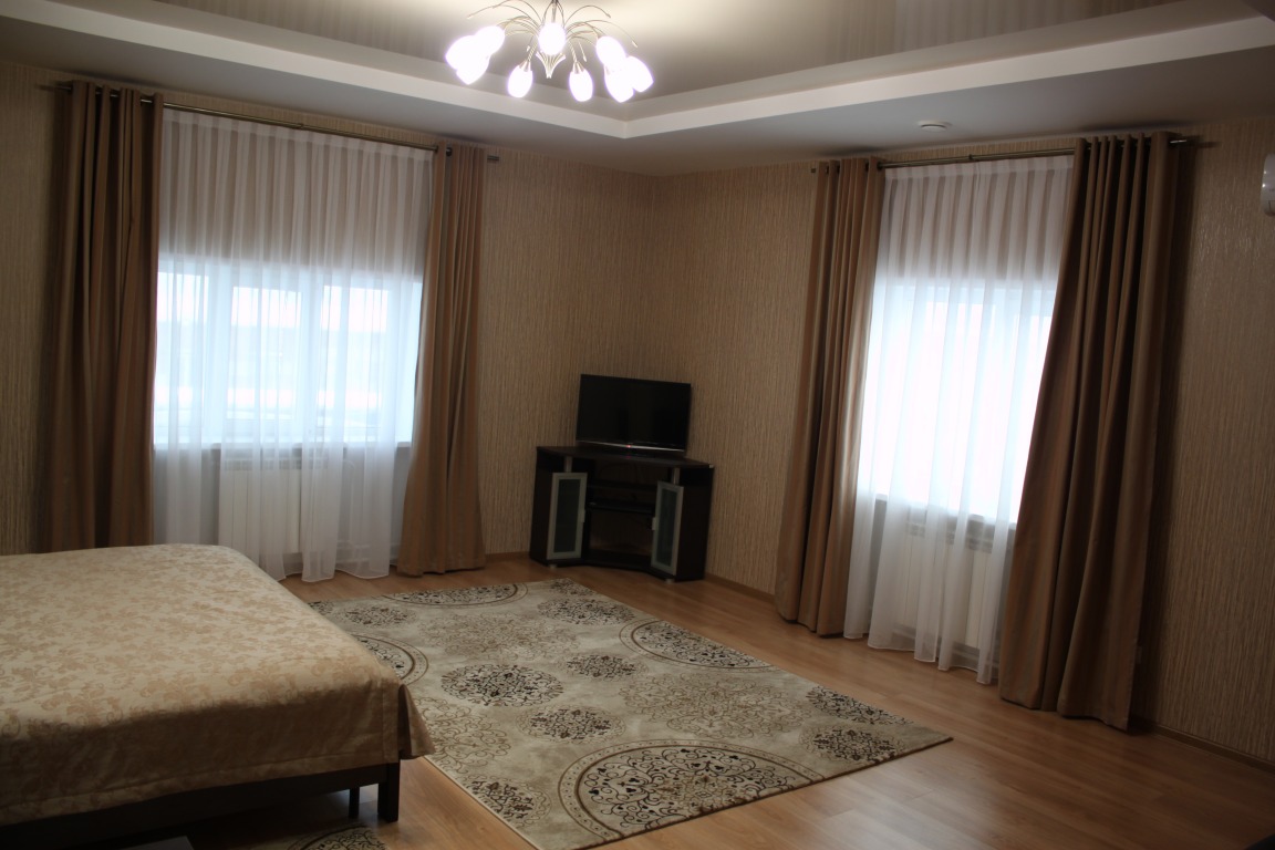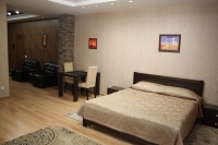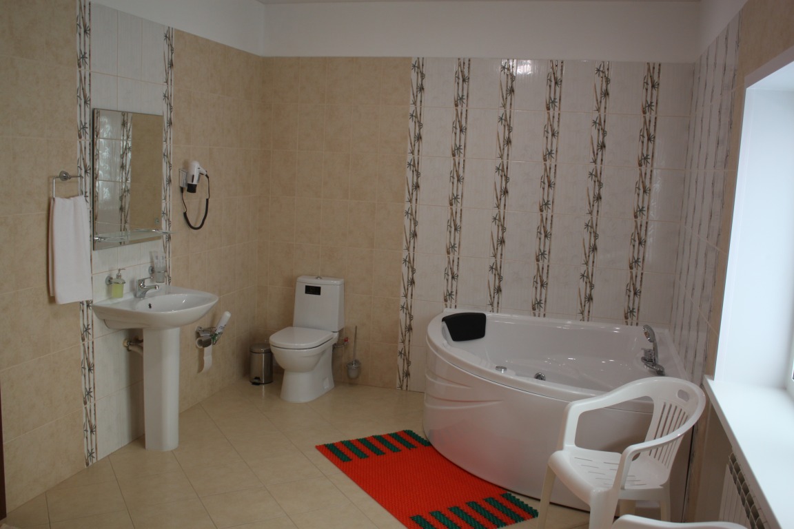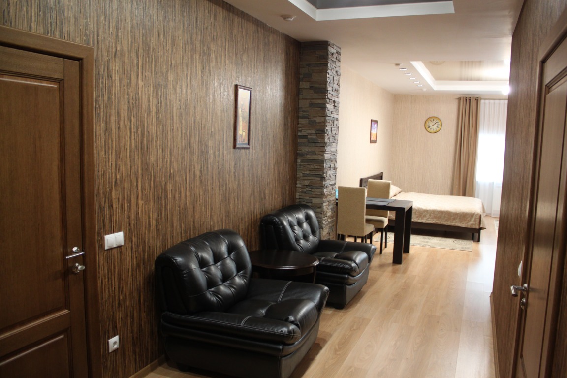 Предложение для самых требовательных клиентов. Вас ждет просторная спальная комната с двуспальной кроватью, застеленной белоснежным постельным бельем. Номер оборудован мягкой мебелью, обеденной группой, кондиционером, мини-холодильником, кулером, TV, выходом в интернет (Wi-Fi), внутренней связью с администратором. Ванная комната оснащена гидромассажной ванной, финской сауной. Для Вашего удобства одноразовые наборы средств личной гигиены, тапочки, халаты, фен. В стоимость номера входит три часа работы сауны.(Дополнительное включение сауны на три часа составляет 1500 рублей.)